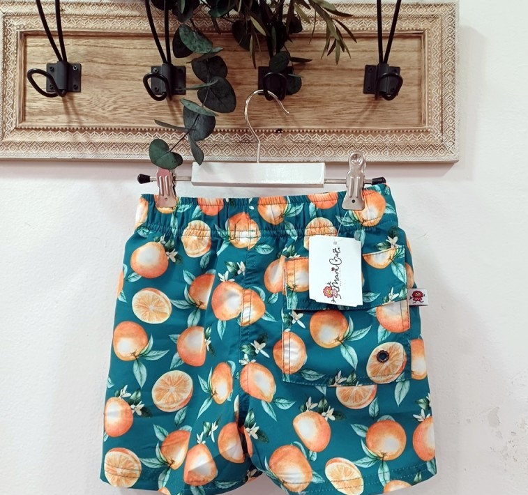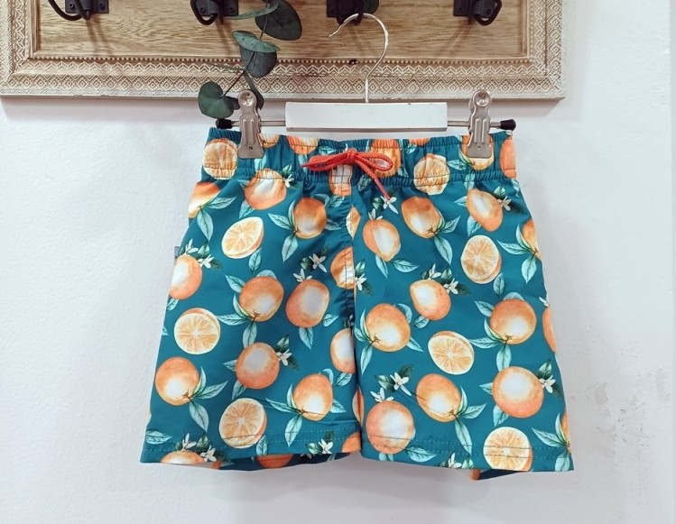 Bóxer de tela estampado naranjas con fondo petróleo.