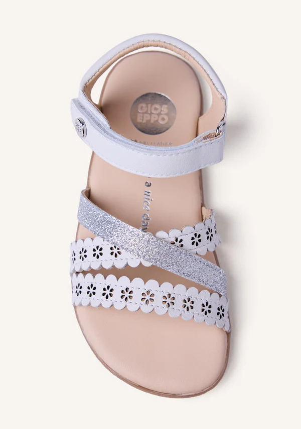 Sandalias de piel calada con flores y detalles brillantes. Diseñadas siguiendo las tendencias minimalistas para garantizar la pisada natural. Cuentan con cierres ajustables en el tobillo.